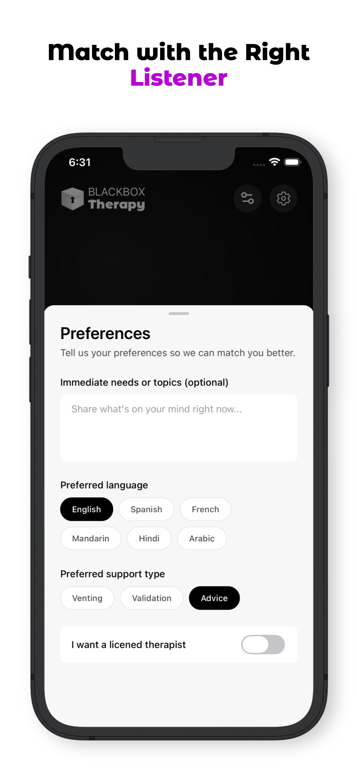 Anonymous support with trained listeners, licensed therapists, and peers. Built to feel calm, clear, and safe.